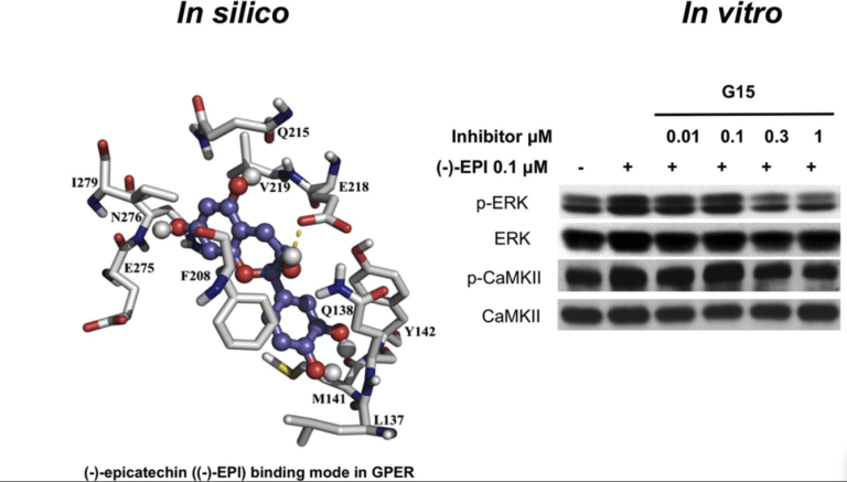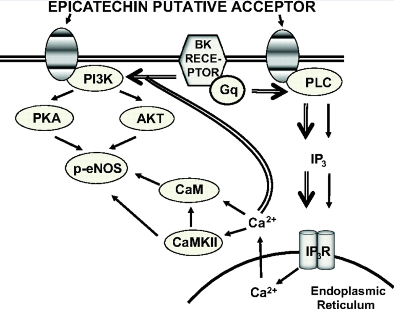 (-)-Epicatechin (EC) is part of a large family of biomolecules called flavonoids and is widely distributed in the plant kingdom. Several studies have shown the beneficial effects of EC consumption. Many of these reported effects are exerted by activating the signaling pathways associated with the activation of two specific receptors: the G protein-coupled estrogen receptor (GPER), a transmembrane receptor, and the pregnane X receptor (PXR), which is a nuclear receptor. However, the effects of EC are so diverse that these two receptors cannot describe the complete phenomenon. The apelin receptor or APLNR is classified within the G protein-coupled receptor (GPCR)