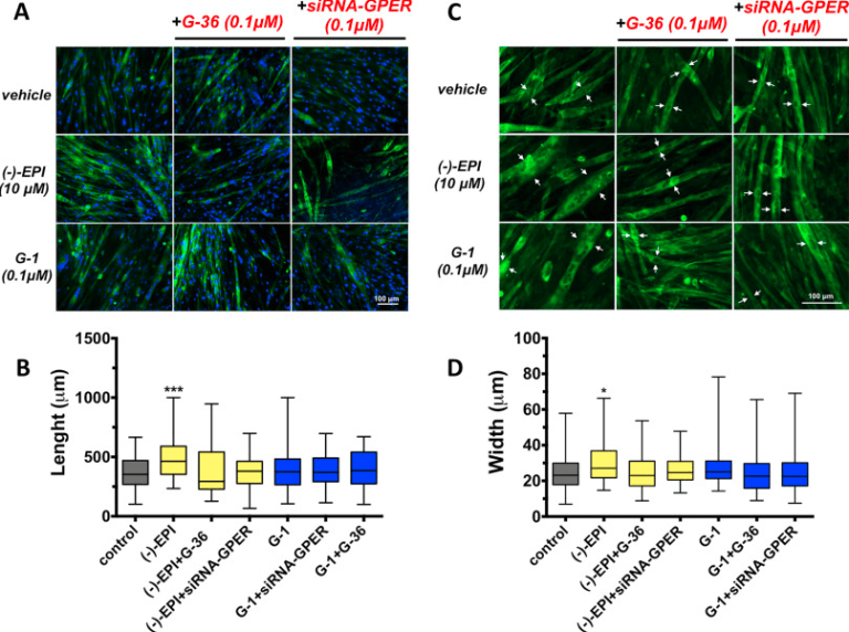 We have reported on the capacity of (-)-epicatechin ((-)-EPI) to stimulate mitochondrial biogenesis (MiB) in mouse skeletal muscle (SkM). However, the mechanisms mediating the effects of (-)-EPI are not fully understood. We previously identified a role of the G-protein coupled estrogen receptor (GPER) in modulating the vascular effects of (-)-EPI. We therefore tested the hypothesis that GPER mediates (at least in part) the stimulatory effects of (-)-EPI on MiB in SkM cells. As an in vitro model, we employed mouse SkM-derived C2C12 myoblasts differentiated into myotubes. Using confocal microscopy, we detected GPER at the cell surface and cytoplasm in C2C12