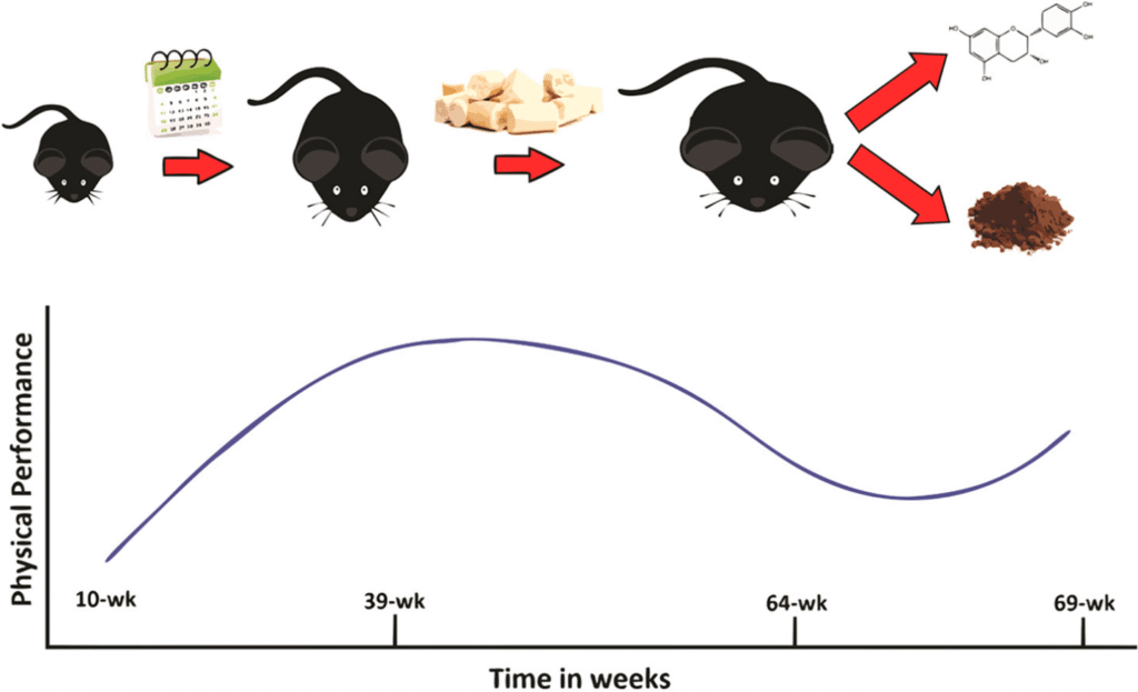 In senile mice, (-)-epicatechin restored markers linked to mitochondrial biogenesis and improved oxidative-stress and aging-related indicators.